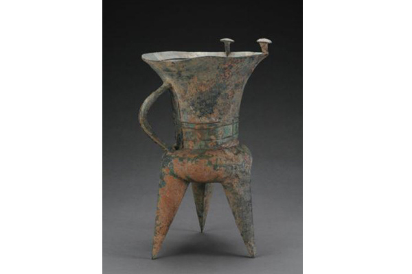 器上部近喇叭形,口上有一对伞状柱,扁鼓腹,下有三个大空锥足,折弧形鋬。颈部饰弦纹与乳丁文,腹部有五个突起的圆形饰。造型古朴,纹饰简单且欠规整。夏代开始,中原王朝的王公贵族开始用合范法来铸造青铜礼器,从而形成了独具特色的青铜文化。