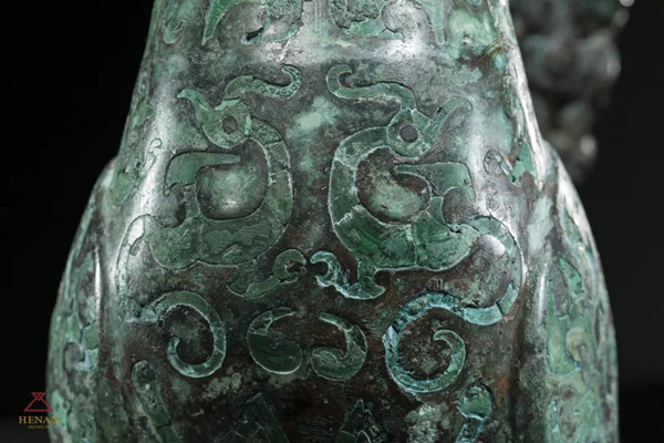 主体为龙首、虎身、龟足,龙张口吐舌,犬齿犀利,龙首上以六条蜿蜒纠绕的小龙构成兽角,背部曲形架上立一同样形态的龙形奔兽,遍布全身的龙凤纹饰,由翠绿色的孔雀石镶嵌而成。