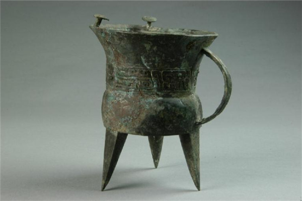 侈口,有加厚的唇边,沿上立两小伞状柱,微鼓腹,平底,附半环形鋬,下铸三足,腰饰一周对夔纹。