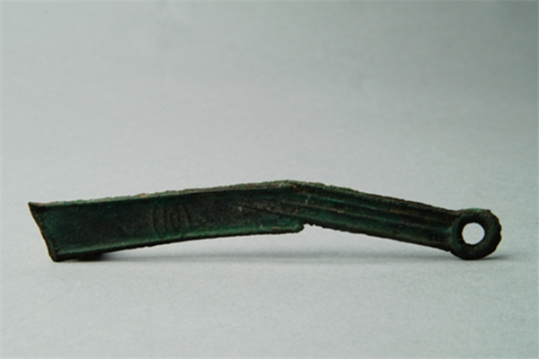 呈刀状,刀尖平钝,刀身与弧背的度数较大。刀身与刀柄连接处略成方折,面的边缘处作隆起状。柄间面背均有二直纹,柄端为圆环状。刀身正面铸阳文大篆“明”。背铸阳文大篆“右、四”。该类刀币是战国时燕国的主要铸币。它铸行时间长、流通广,数量多。