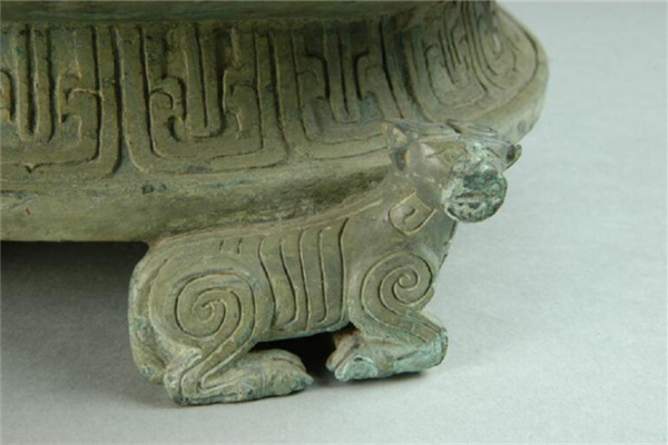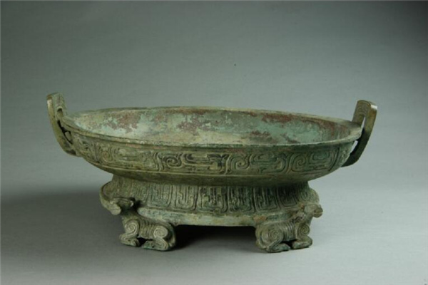 平折沿略向内倾斜,浅腹,一对附耳高出盘口,底近平,圈足下有四个侧首卧兽以背承器。盘腹与圈足分别饰窃曲纹与垂鳞纹。器内底铸有铭文3行20余字:“□□单自作□盘其万年□□子子孙孙永宝用享”。