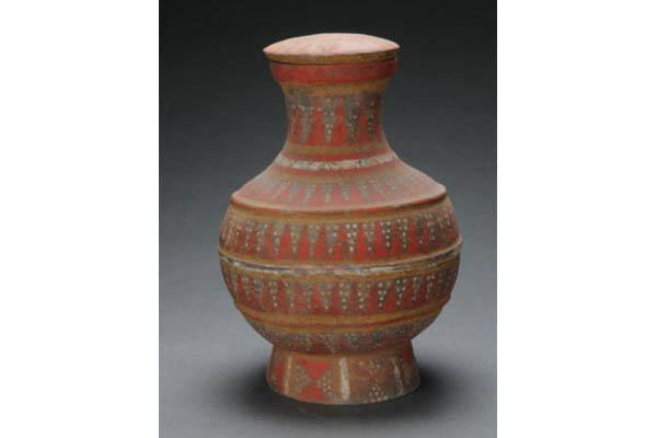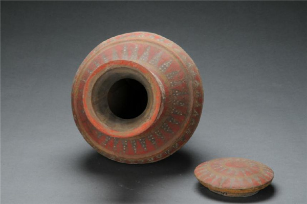 壶敛口,斜折沿,束颈,斜肩,鼓腹下收,喇叭形圈足,口上承以带子口的凸面圆盖。盖与壶身饰以相同的朱红色与灰色锯齿纹,足上饰朱红色对顶三角形夹灰色三角形。灰地上饰白彩珍珠纹。