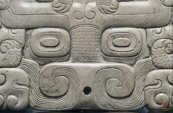 玉牌呈上宽下窄的倒梯形,青玉质,上、下端居中钻有圆孔,推测应为组合玉佩的主体。玉牌正面下部浅浮雕兽面纹,两侧对称装饰龙头,做瞠目吐舌状。四周的牙脊实为两侧龙首的口舌、鼻、目、角的轮廓,细部填以缜密的束丝纹和鳞纹。玉牌左上部一组龙纹虽未完成,但仍不失为一件绝世精品。