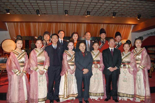 何鲁丽一行与华夏古乐团成员合影留念。