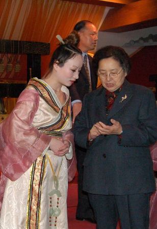 何鲁丽与华夏古乐团演员亲切交流。