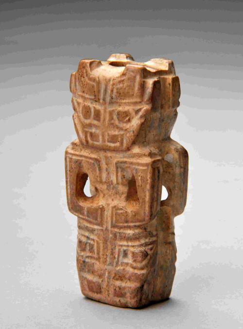 圆雕,两面纹饰相同。呈立状,头顶两侧各饰一隆起发饰,臣字目、方脸、尖颚、大嘴、双臂抱于腹前,臂与身躯之间均有一穿孔。