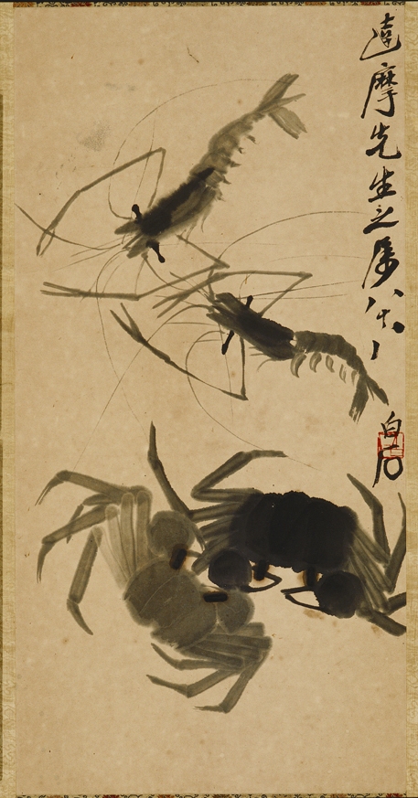 白石老人画虾师法造化,在写生中多次提炼,不断变革墨法,最后终以寥寥数笔淋漓尽致地将虾的质感表现出来。老人画蟹也源于生活,手法一变再变,晚期蟹壳画成三笔,蟹壳和蟹足均有质感,自成一格。